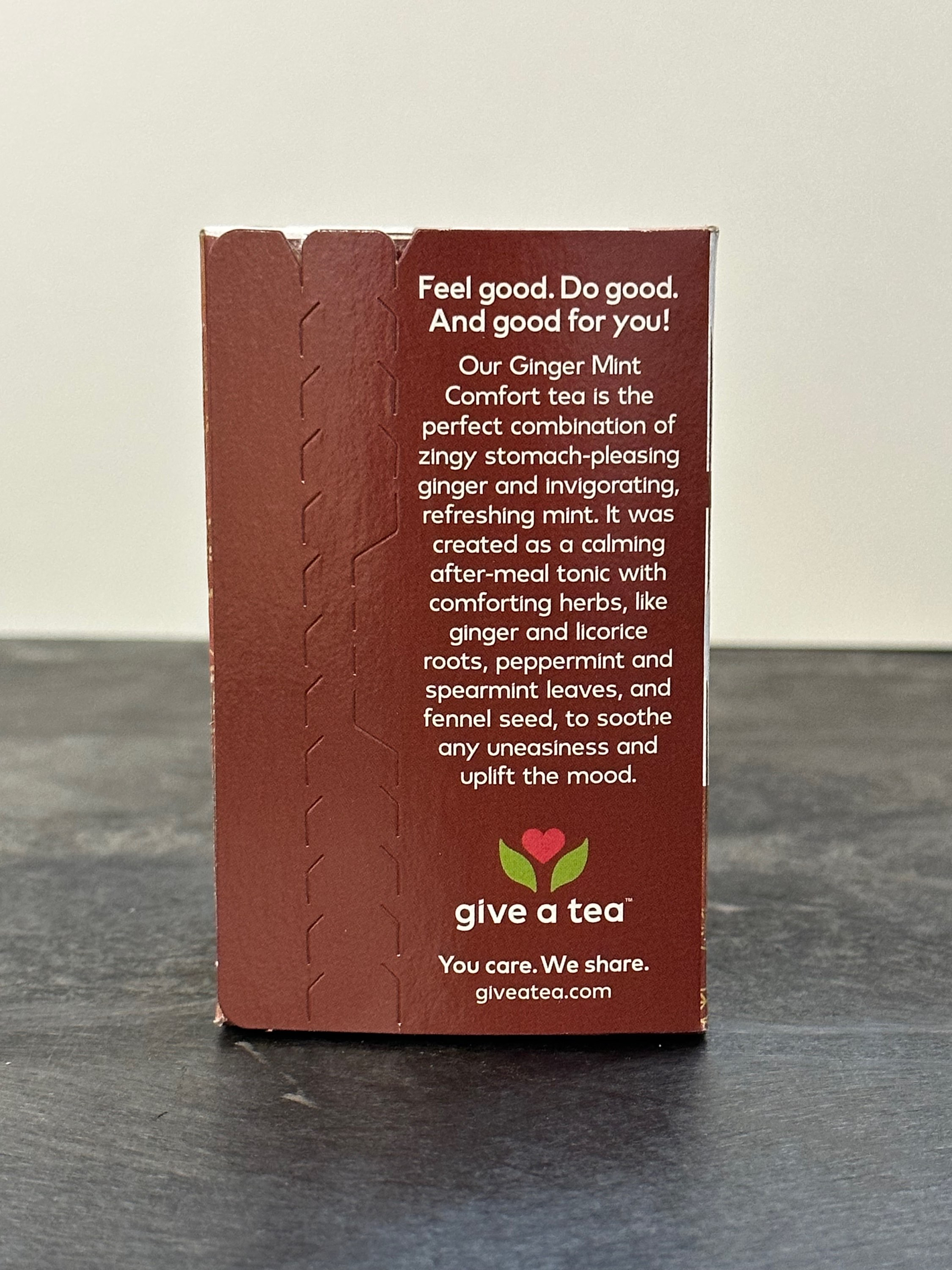 Discover tranquility in every sip with Give a Tea Ginger Mint Comfort, now available at Water Tree Galveston. This caffeine-free herbal blend is expertly crafted to soothe and calm the digestive system. Combining the warming properties of ginger root with the refreshing and calming effects of peppermint and spearmint, it delivers a balanced and satisfying experience. Enhanced with additional herbs such as licorice root and fennel seed, this blend offers comprehensive digestive benefits, perfectly aligning with our dedication to promoting health and wellness through fresh alkaline water. Enjoy a moment of comfort and well-being with each flavorful cup.